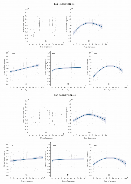 世界衛生組織估計,每八人中就有一人面臨嚴重心理健康問題,但僅有28%的人獲得治療。在此挑戰下,城市綠化作為一項極具潛力的公共衛生干預措施,正日益受到關注。數十年的研究證據表明,綠色環境有助於減輕壓力、焦慮和抑鬱,並提升注意力及認知表現。然而,不同情境與文化背景下的研究結果差異較大,這為城市規劃和設計制定可操作目標帶來了挑戰。「劑量-反應 (dose-response)」關係的具體形態一直未有定論,早期研究多認為其為線性關係,但近年來越來越多的研究指出,綠化與心理健康之間可能存在曲線型關係,即適度綠化可帶來最大益處。
